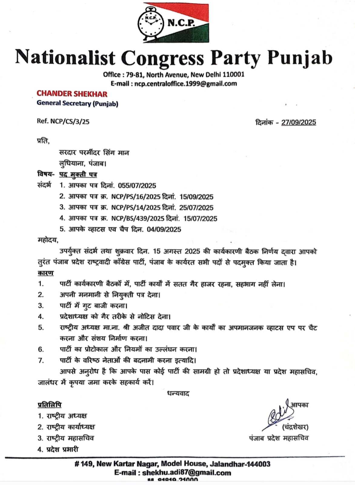 राष्ट्रवादी कॉंग्रेस पार्टी [पंजाब] ने परमिंदर सिंह मान को दिखाया बाहर का रास्ता